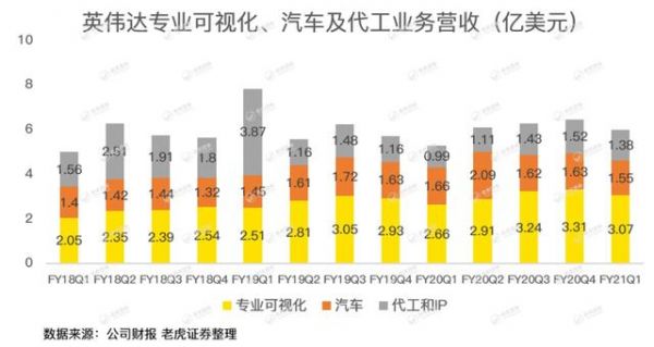 最后,英伟达还拥有专业可视化、汽车和代工及IP业务。其中,专业可视化主要为Quadro系列GPU,主要用于设计、电影特效制作等领域。单季营收在3亿美元左右,成长性和未来空间的诱惑力一般。