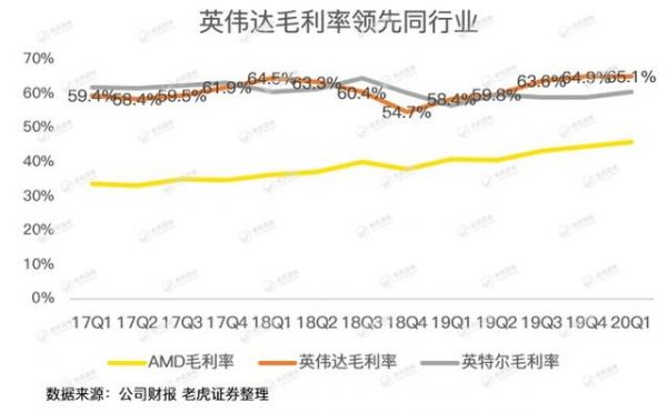 从毛利率角度看,英伟达一季报毛利率65.1%,领先同行AMD一大截,也高于英特尔的60.6%,处于近年来的历史高水准。