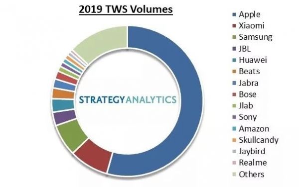 根据Strategy Analytics给出的数据,2019年AirPods销量接近6000万副,增长率超过70%,还拿走了TWS市场71%的销售额。根据各大机构的分析师预测,2020年,AirPods的销量可以达到1个亿。