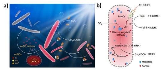 可见光中的光子通过照射进入热醋穆尔氏菌细胞质中的金纳米簇,将其激发产生一个电子(e-)和一个空穴(h+),为了防止产生的电子和空穴再次结合,金纳米簇外包裹的半胱氨酸(Cys)就起到作用了,半胱氨酸被空穴氧化生成胱氨酸(CySS),在这个过程中成功消耗掉金纳米簇中的空穴。而被激发产生的电子和吸收的CO2在一类酶中间体中相遇,通过乙酰辅酶A路径(Wood-Ljungdahl路径主要存在于厌氧细菌和古细菌中,依靠 CO/CO2和H2为碳源和能源用于合成代谢和分解代谢),成功合成醋酸分子产物,并释放到培养液中,并被收集利用。