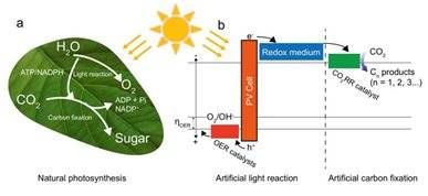 自然光合作用与人工光合作用对比(图片来源:Nat Commun. 2018, 9, 5003)