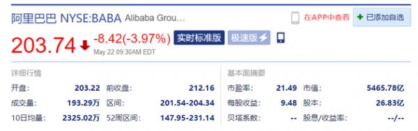 新浪科技讯 5月22日晚间消息,阿里巴巴开盘跌4.2%,报203.22美元。