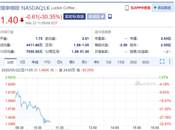 瑞幸复盘第二日股价再跌29% 市值仅剩约5亿美元