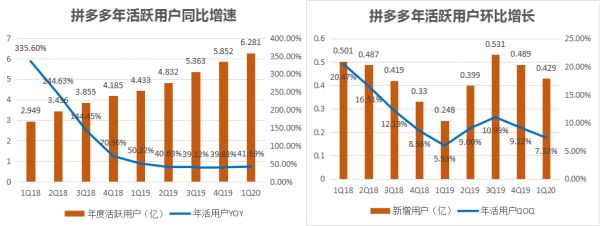 年活跃买家数是指在过去12个月,在拼多多上至少下过一单的消费者人数,包括独立app、小程序和H5等移动端渠道。2020年第一季度,拼多多年活跃用户迈入6亿里程碑,较上年同期新增1.85亿。