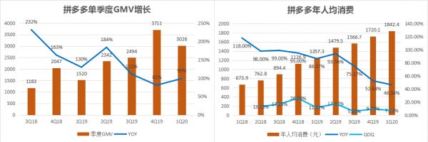 具体来看,商家因疫情压力减少了营销推广和广告支出,拼多多在此期间推出激励方案,降低佣金率的同时降低商家在平台上的营销成本,并上线“抗疫频道”,把免费流量资源倾斜给口罩、体温计、抗病毒冲剂等应急医疗用品。这使得拼多多GMV翻倍增长,营收增速却下滑严重、创历史新低。