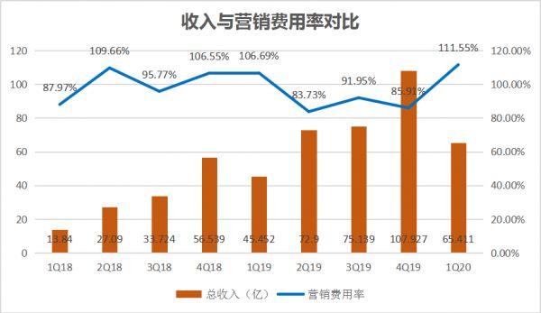 另一方面,拼多多向快递公司下发通知,向满足履约时效的涉及“百亿补贴”和“守护健康共渡难关”抗疫频道的物流订单进行定向补贴,补贴不设上限。为支持直播带货业务,拼多多还在云服务和宽带成本方面大量投入。这都使得拼多多一季度销售成本急剧增加,销售及市场推广费用达到72.97亿元,营销费用率涨至前所未有的111.55%。