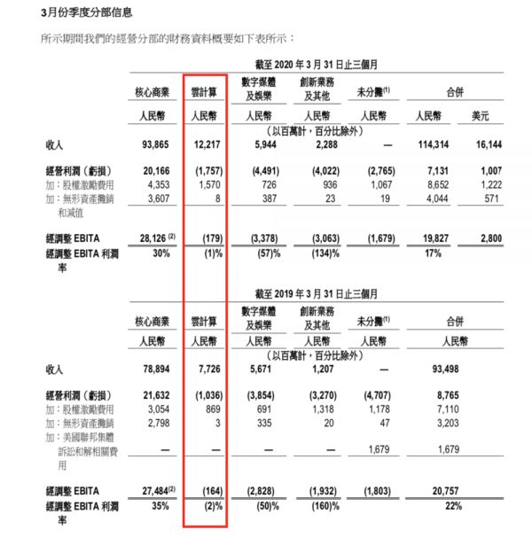 财报中指出,阿里云2020财年经调整EBITA亏损人民币1,414百万元(199百万美元),2019财年为亏损人民币1,158百万元。相应的经调整EBITA利润率从2019财年的负5%改善至2020财年的负4%。