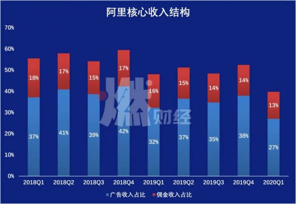 另外,疫情期间商家复工困难,以及受制于快递物流,订单量缩减,这也导致淘宝天猫的订单成交量降低。一季度,天猫实物GMV增速只有10%,是历史最差。与此相对应,阿里一季度佣金收入145亿元,相比去年负增长。