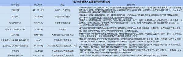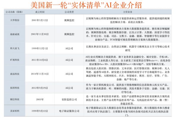 但我在对这33家公司与个人做了梳理后发现,本次被纳入的主要是3类公司,一类是以人工智能软硬件开发与网络通信服务为主的技术公司,特别是下面表格中的这9家企业。