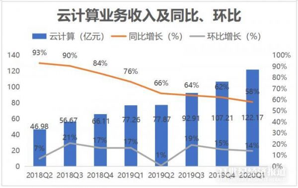 云计算是阿里增长速度最快的一个业务,2020年一季度实现营收122.17亿元 ,同比增长58%,环比增长14%,主要是来自公共云与混合云业务的收入增长。疫情影响该业务的付费服务以及进行中的项目进度,一季度增速也出现衰减。从整体增速来看,最近八个季度阿里云计算业务同比增速处于连续下滑的趋势中。