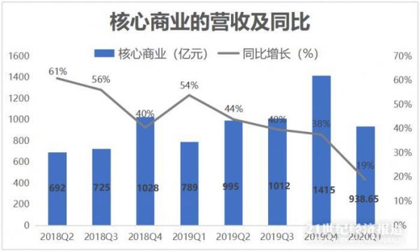 核心商业在2020年一季报实现营收938.65亿元 ,同比增长19%,但从上图可以看到,这已经是公司最近八个季度最低的增速,增速显著放缓。