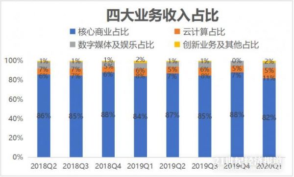 分业务来看,阿里的业务有四大板块,分别是核心商业业务、云计算业务、数字媒体及娱乐业务、创新业务及其他。其中,核心商业一直是阿里最重要的业务板块,占比均超过80%,其次是云计算业务,占比在本季度扩大到11%,是阿里增长最快的业务,其他两块业务在一季报的占比为5%和2%。