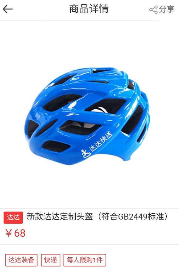 其中,达达商城中,新款定制头盔售价68元,特意标注了符合GB2449标准,显示每人限购1件;美团平台上,骑手的夏盔原价58元现在售价49元,冬盔原价79元现在售价49元;饿了么上头盔有两种,一款2020年夏盔售价62元,一款19年冬盔售价75元,还提供了下巴罩、盔镜等不少配件;点我达平台商城上的定制头盔又叫“战盔”,售价69元;闪送商城上可以购买到“闪送四分之三头盔”和“闪送揭面头盔”两种头盔,分别售价189元、220元。