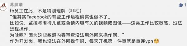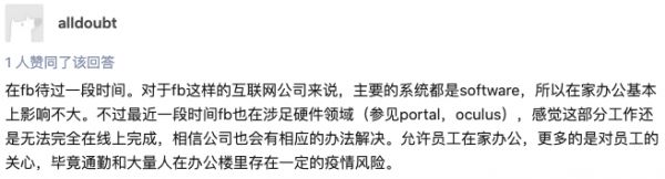 fb前员工表示,对于fb来说,主要系统都是软件,所以在家办公影响不大。不过最近fb涉足硬件领域,这部分工作是无法线上完成的。