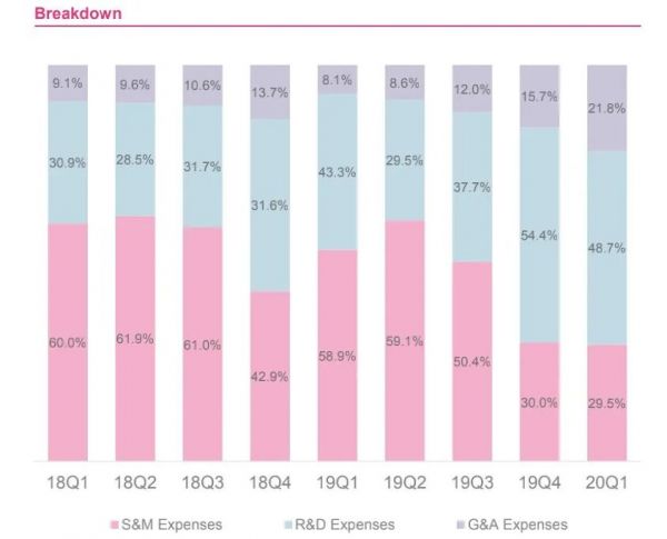财报显示,荔枝第一季度整体运营费用为1.206亿元,与去年同期的8800万元相比增长了37%,与上一季度的9620万元相比增长了25%,其中研发费用占比,从2018年第一季度至本季度自30.9%扩大到了48.7%,本季度5840万元的支出与去年同期的2900万元人民币相比增长101%。