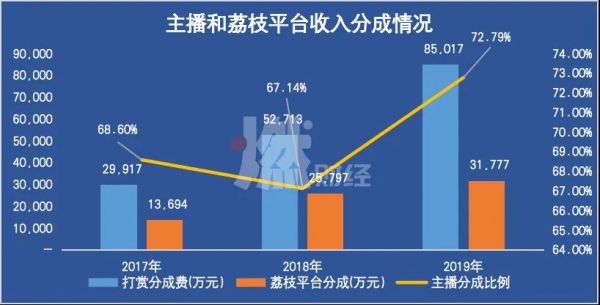 一来为了保住直播打赏的收入,二来,随着在线音频行业UGC入局者增多,竞争加剧之下,整个行业的主播分成比例一直被抬高。根据2019年年报显示,荔枝的主播分成(从收到的拟礼物或货币的销售额中抽成)比例高达72.79%。