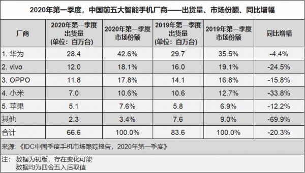 2020年的手机行业猝不及防地遭遇了新冠疫情这只黑天鹅,受到了沉重打击。根据IDC公布的数据,今年第一季度,全球手机出货量为2.758亿部,同比下滑11.7%。销量排名前五的厂商中,只有小米和vivo两家品牌保持销量增长。苹果的情况还算不错,销量微跌0.5%。