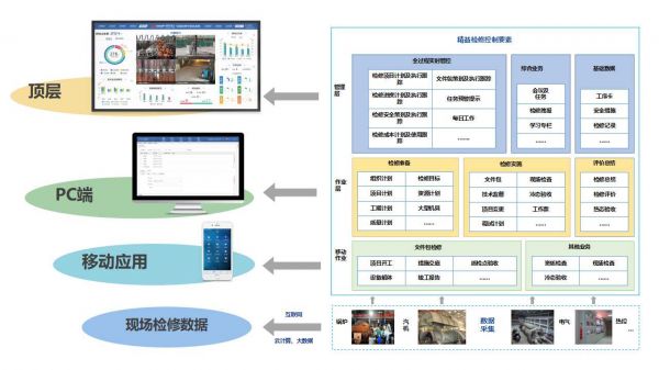 公司推出了“发电机组精益检修智能管控平台”,包括移动作业层、作业层以及管理层。移动作业层以App形式服务于一线作业人员,支持设备解体拍照、图片在线编辑、检修记录随时填写等功能,同时打通了管理层,作业人员可在线签字、确认各类审批;作业层主要在PC端呈现,属于组织、控制整个检修工作;而管理层相当于维修后台,统一呈现维修过程、数据,并对维修全过程实时管控。