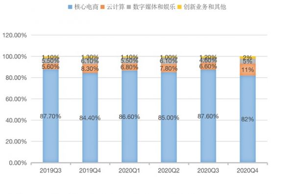 而核心电商板块依然是阿里赖以生存的基础。其中,“淘宝+天猫”作为核心中的核心,贡献了约60%的营业收入,而这一部分正是近期阿里受冲击最大的部分。