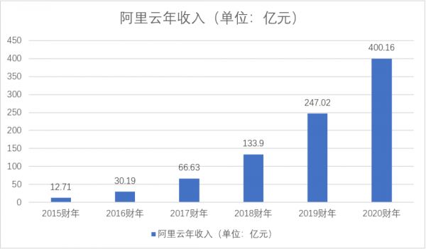 阿里云带来的收入稳定高速增长,2020财年收入破400亿元,比上一年度247亿元的收入增长了62%,六个财年的营收增长超过三十倍。