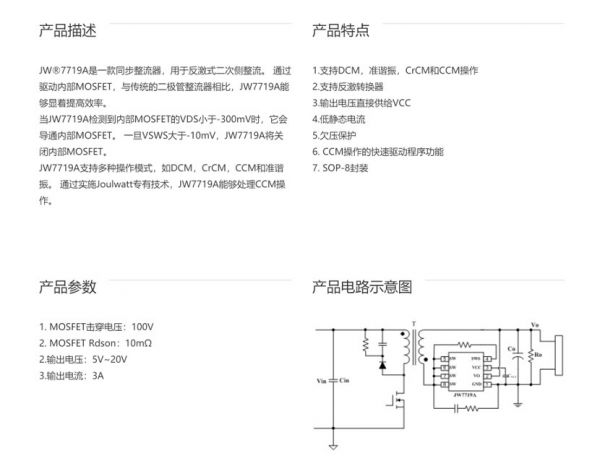 以杰华特JW7719A为例,该产品是一款同步整流器,用于反激式二次侧整流。 通过驱动内部MOSFET,与传统的二极管整流器相比,JW7719A能够显着提高效率。