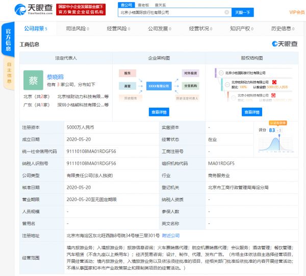网易科技讯 5月25日消息,天眼查数据显示,5月20日,北京小桔国际旅行社有限公司成立,该公司注册资本5000万人民币,法定代表人为蔡晓鸥,公司经营范围包括境内旅游业务;入境旅游业务;旅游信息咨询;火车票销售代理;航空机票销售代理;会议服务;酒店管理;餐饮管理;汽车租赁(不含九座以上乘用车)等,由北京桔财动力科技有限公司全资控股,后者由滴滴关联公司北京小桔科技有限公司全资持股。