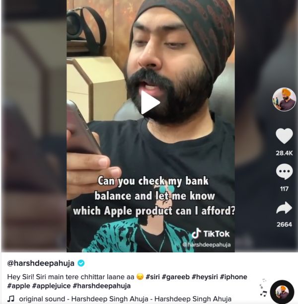 哈什迪普·阿胡加专门发布搞笑视频,发布了今年情人节的10大病毒视频之一—— “Hi Siri, 帮我查一下我的账户余额,还能负担什么苹果产品。” “苹果汁。”