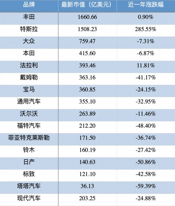 不过,行业整体低迷之余也有惊喜出现。数据显示,特斯拉最新市值超过1500亿美元,近一年增幅高达285.55%,成为市值仅次于丰田汽车(TM)的上市车企。据了解,丰田汽车当前市值为1660.66亿美元。