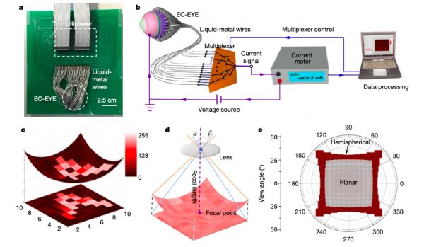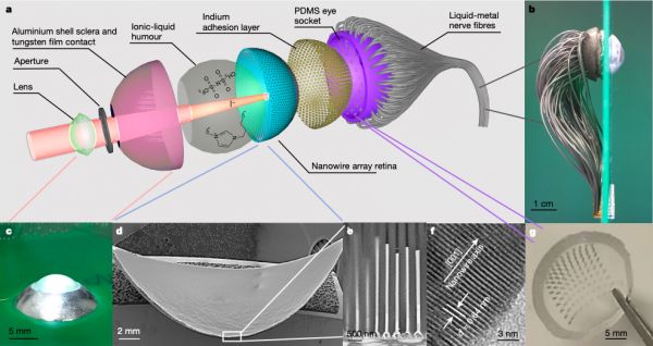 具体从构造上来看,团队通过在半球形氧化铝膜上排布高密度钙钛矿纳米线(nanowires)阵列来模拟人类视网膜上的光感受器,其背面连接的液态金属线用来模拟人类视网膜后的神经纤维,以此实现了人造半球形视网膜的设计。