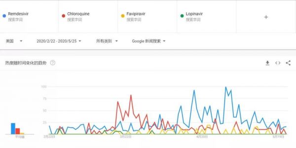 在地球另一端的美国,谷歌趋势也有类似表现:瑞德西韦关注度远高于其它潜在药,包括特朗普极力推荐的氯喹,但热度同样快速下降。