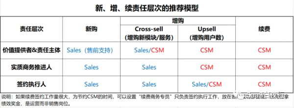 咱们直接说结论:续费应该由CSM(客户成功经理)负责,增购中Upsell责任主体也是CSM,Cross-sell责任主体可能是Sales(销售代表)也可能是CSM。 为了方便理解,我画了一张表: