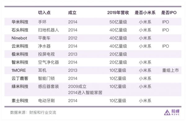 这些企业大多成立于 2014 年,十家里九家是小米生态链企业,有三家上市企业,还有三四家在报材料的路上。他们的共性都是靠大爆品起家,起点都是单一产品,用了一两年时间做研发,才推向市场。通常第一次众筹就达到千万收入,展现了爆品的潜力,靠一款产品攀爬到小几千万的月收入,再从一个产品拓展到一个品类,比如纯米从净水器拓展到厨房家电品类,云丁鹿客从门锁拓展到家居安防品类。