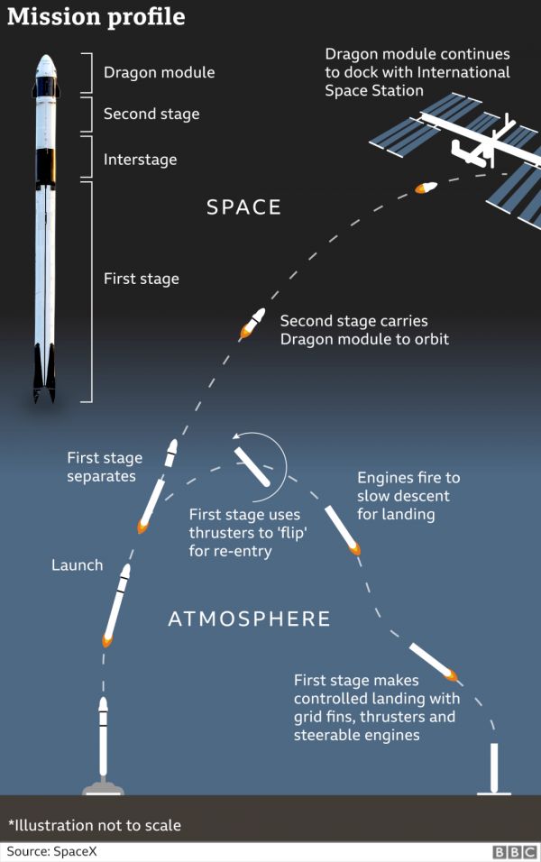 因为猎鹰9号是两级火箭,它的下段将在关闭并分离之前的2.5分钟进行发射,这将使第二阶段再燃烧六分钟,以使Dragon进入轨道,接下来,太空舱将使用其自己的推进器完成到国际空间站的其余旅程。