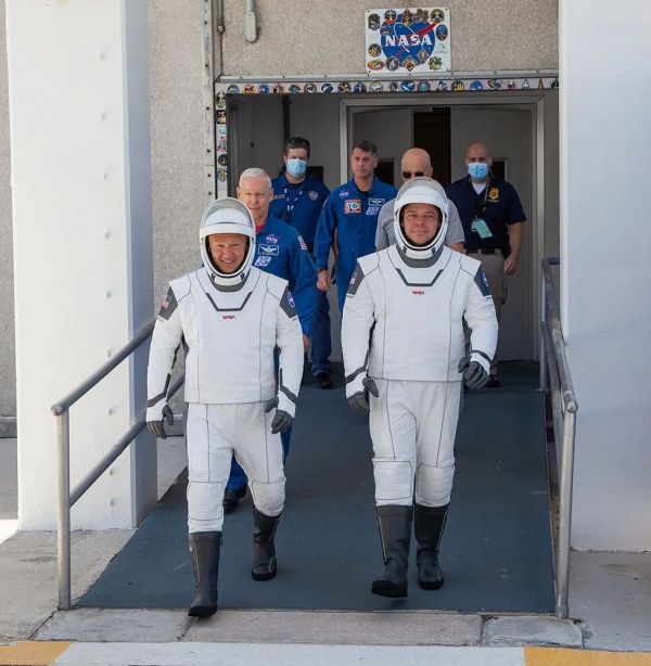 NASA宇航员赫利和贝肯穿上他们的SpaceX太空服后,将使用全新的乘员通道臂登上火箭。