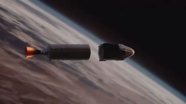 在第一阶段分离后仅几秒钟,火箭的第二阶段将为其引擎点火,约六分钟之后,“载人龙”号飞船将脱离火箭。