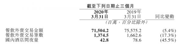 餐饮外卖交易金额、笔数,国内酒店间夜量也都出现下跌,其中,餐饮外卖交易额为715亿元,较去年同期的756亿元下跌5.4%;餐饮外卖交易笔数14亿,较去年17亿下跌17.3%;国内酒店间夜量4280万,较去年同期7860万下跌45.5%。