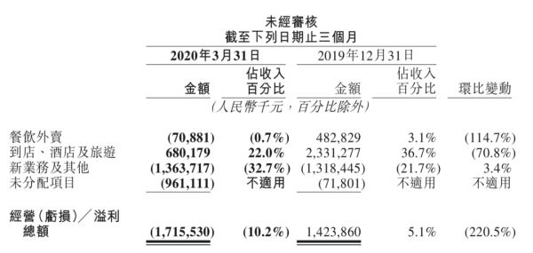 财报显示,第一季度餐饮外卖亏损7090万元,相较2019年第四季度盈利4.83亿元,经营利润率从3.1%转为负0.7%;2020年第一季度餐饮外卖业务亏损同比收窄,经营利润率同比改善0.7个百分点。