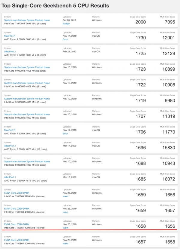 如果该跑分属实,那么A14芯片的单核跑分已经和Intel Core i7-8086K 4000 MHz (4 cores)并列TOP 13!谁能说这不是个奇迹呢?