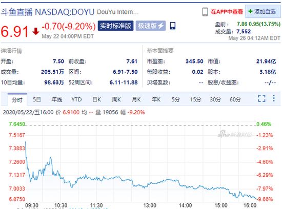 新浪科技讯 5月26日下午消息,斗鱼美股盘前涨超13%,截止发稿涨幅达13.75%,报7.86美元。