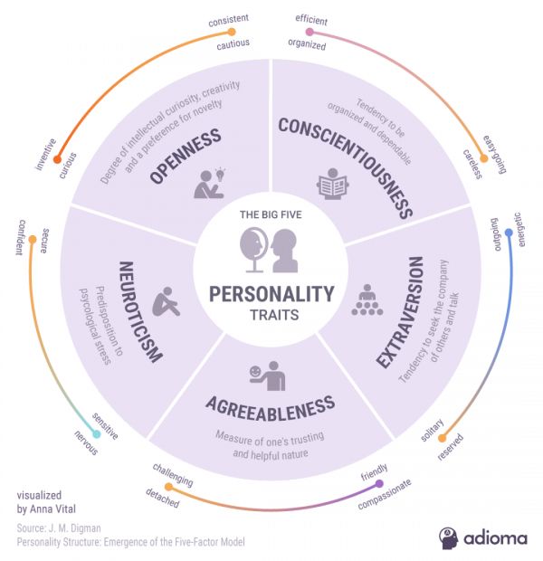 在对志愿者识别结果的分类上,研究人员参考了五大人格特征(Big Five),即责任心(conscientiousness)、神经质(neuroticism)、外向性(extraversion)、亲和性(agreeableness)、开放(openness)。