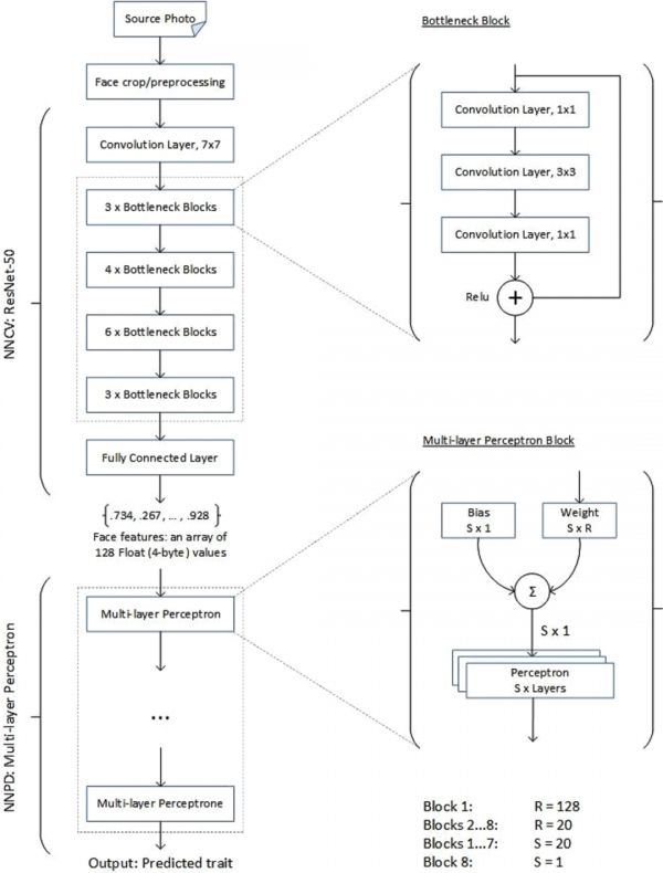 同时,研究团队训练了人格诊断神经网络(NNPD),该网络被实现为多层感知器。NNPD将从NNCV获得的不变量的向量作为输入,预测输出五种人格特质,整个过程分别针对男性和女性面部识别进行。
