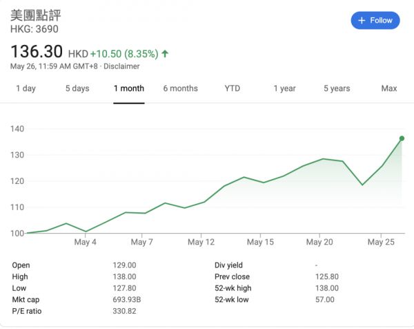 但回到股票市场上,美团股价却一直坚挺。财报发布之前,美团的股价就蹭蹭地往上涨,两个月涨幅近 70%。5 月 25 日财报发布当日,股价又涨了 6%。5 月 26 日早间港股一开盘,美团股价再次上涨。