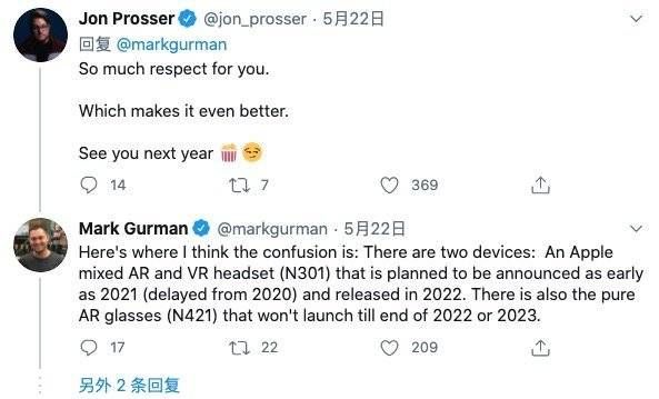 随后他还回复,目前他所知的苹果头戴式设备有两款,一个是具备 AR/VR 能力的头戴式设备,预计会在 2021 年发布,2022 年上市。