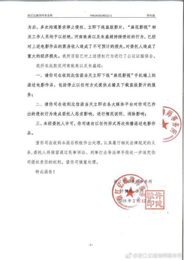 e公司APP2月12日消息,2月12日,电影《流浪地球》、《廉政风云》、《熊出没:原始时代》委托浙江亿维律师事务所发布联合维权声明,向涉嫌盗版的手机端软件“麻花影视”发送律师函,敦促对方停止侵权,立即对盗版资源进行下线处理。声明还称,将保留进一步追究责任的权利。