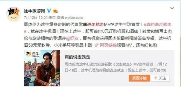 值得一提的是,据中国基金报报道,途牛旅游网曾经有两大男神代言:一个是周杰伦,2016年,作为途牛代言人的周杰伦曾给途牛创作了一首主题曲叫《说走就走》;