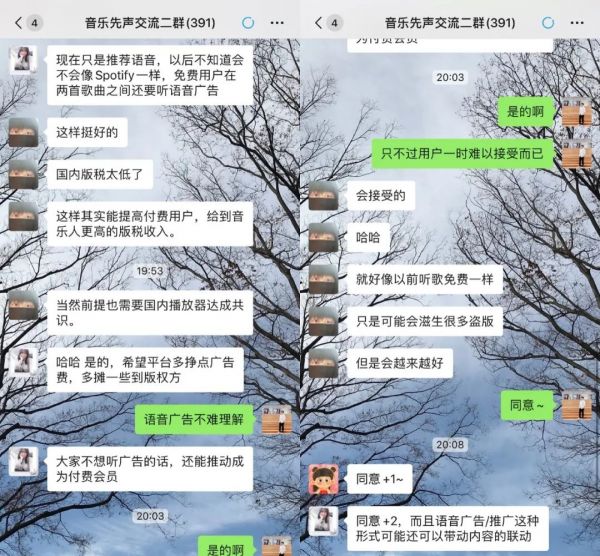 说回QQ音乐插播语音广告,业内反馈和大众抵触其实是不大一样的。以音乐先声读者群中从业者的讨论来看,大多对这一尝试表示了支持,认为“这样其实能提高付费用户,给到音乐人更高的版税收入”、“希望平台多挣点广告费,多摊一些到版权方”、“语音广告/推广这种形式可能还可以带动内容的联动”。