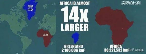 但是,由于越靠近两级,将地球拉成圆柱的过程地表上的点“走”的路程越多,相邻纬线间隔由赤道向两极增大,面积变形也随之增大。也就产生了上面提到的面积不一的误解:格陵兰岛就算和非洲(后者实际面积是前者10倍以上)相比,也会呈现出压倒性的优势。