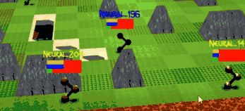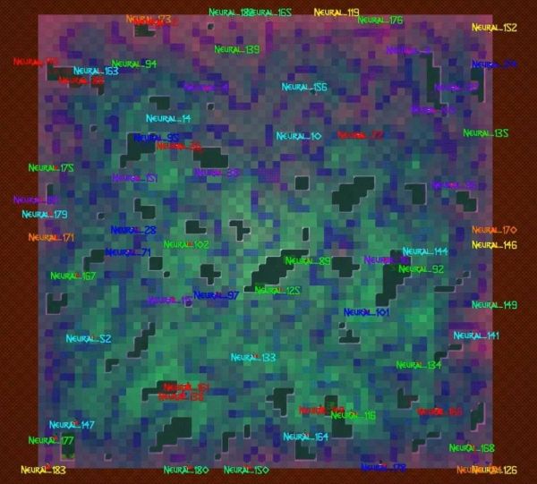 在最初的狭小地图中,AI们确实不可避免地发生了战斗。这很大程度上不仅是由于资源有限,更多的其实是因为它们没有尝试其他选择的机会——每个AI都被设计有战斗策略,几个AI遇到一起总会有AI判断需要先开火,最后混战在所难免。