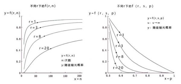 把不同r对应的f(r,n)和f(r,s,p)放到同一个图中进行比较,它形象地揭示了赌徒输光定理的含义:所谓的“公平”赌博,其实并不公平。