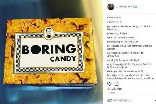 他随后还真的在自己的社交媒体上晒出了一款“无聊”牌糖果(Boring Candy),品牌是SpaceX的子公司无聊公司(The Boring Company)。